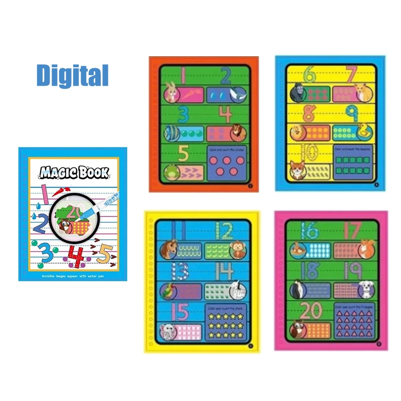 Cada livro possui 4 páginas reutilizáveis e uma caneta de água recarregável.